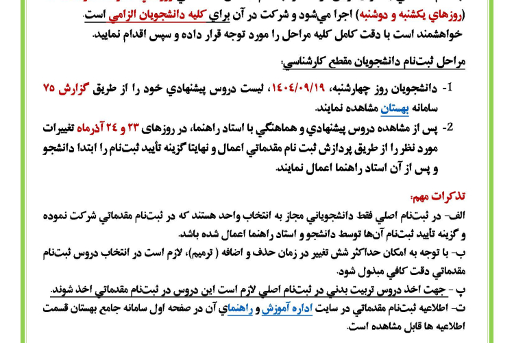 اطلاعيه ثبتنام مقدماتي نيمسال دوم سال تحصيلي 1405-1404 دانشجويان مقطع کارشناسي