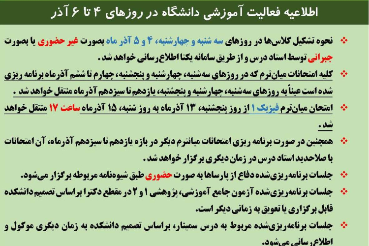 اطلاعرسانی پیرامون فعالیت آموزشی دانشگاه در روزهای 4 تا 6 آذر 1404