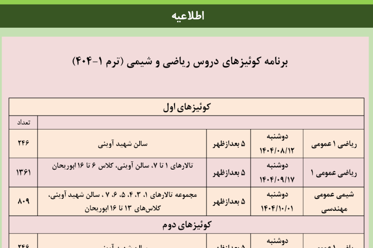 اطلاعيه مهم آموزشي پيرامون زمان و مكان برگزاري امتحانات كوييز و ميانترم دروس پرجمعيت 4041