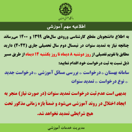 اطلاعیه مهم آموزشی پیرامون درخواست تمدید سنوات ترم 4042 پیوست اندازه اطلاعیه مهم آموزشی پیرامون درخواست تمدید سنوات ترم 4042 368.38 کیلوبایت
