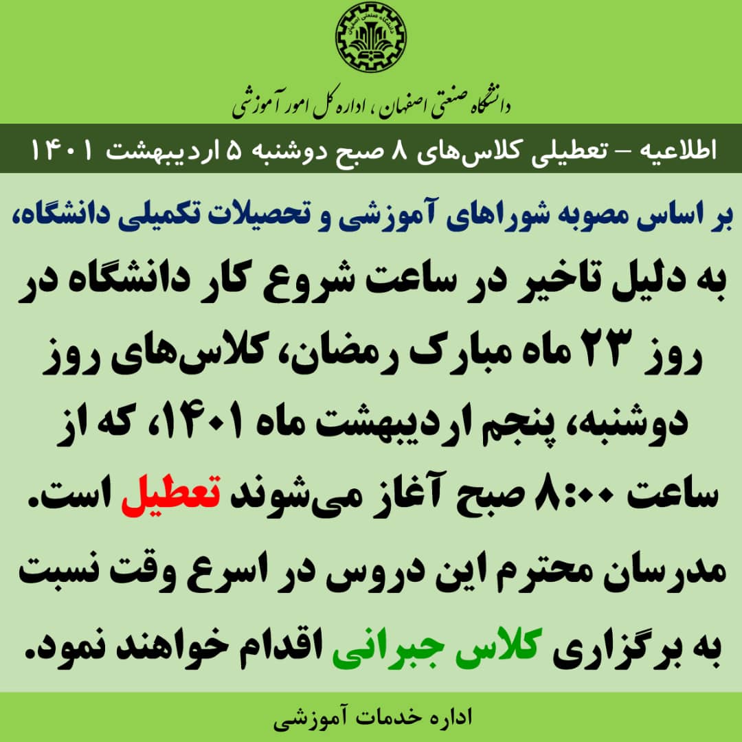 اطلاعيه تعطيلي صبح روز پنجم ارديبهشت ماه 1401 پیوست اندازه اطلاعيه تعطيلي صبح روز پنجم ارديبهشت ماه 1401 126.72 کیلوبایت