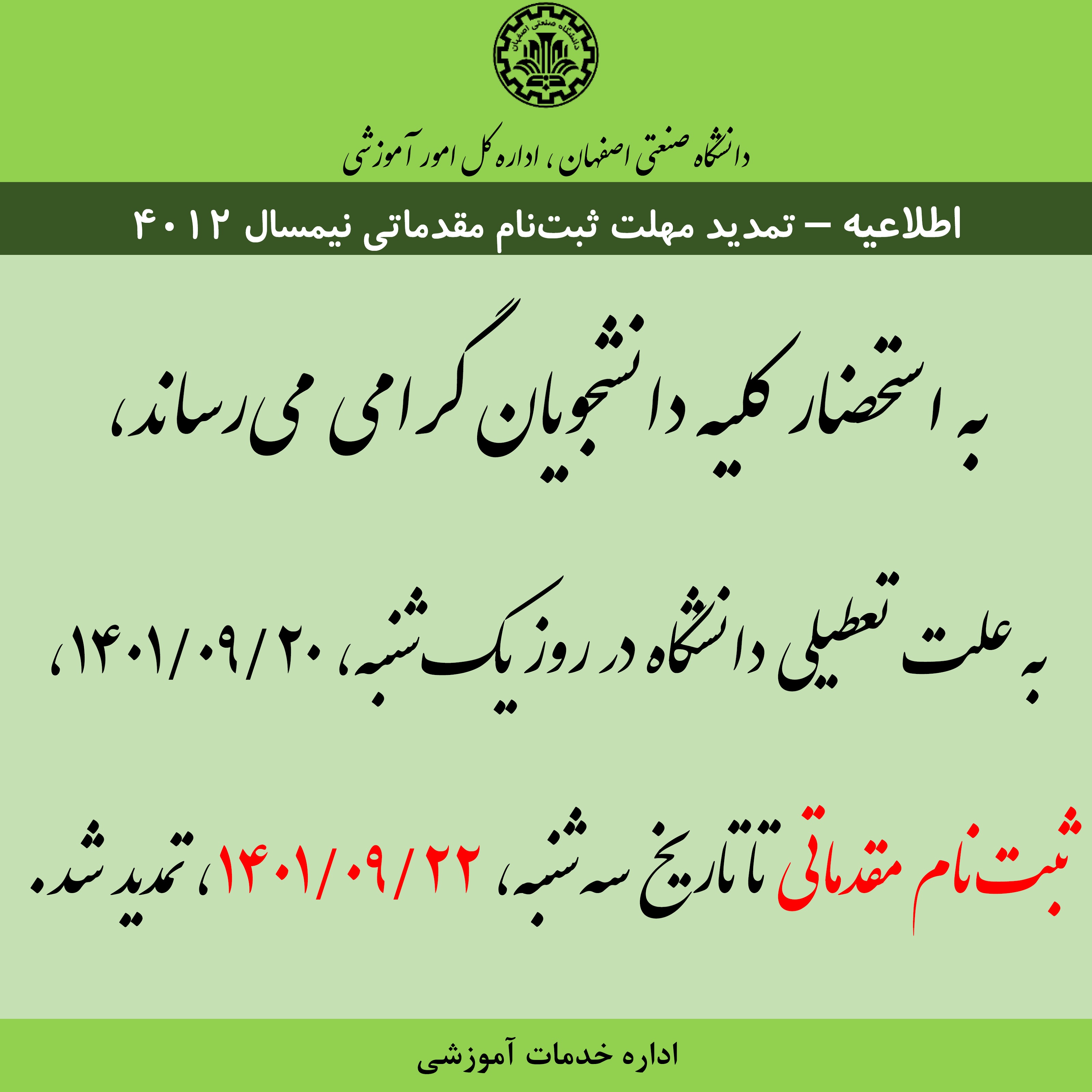 تمديد مهلت ثبت نام مقدماتي نيمسال 4012 پیوست اندازه تمديد مهلت ثبت نام مقدماتي نيمسال 4012 115.6 کیلوبایت